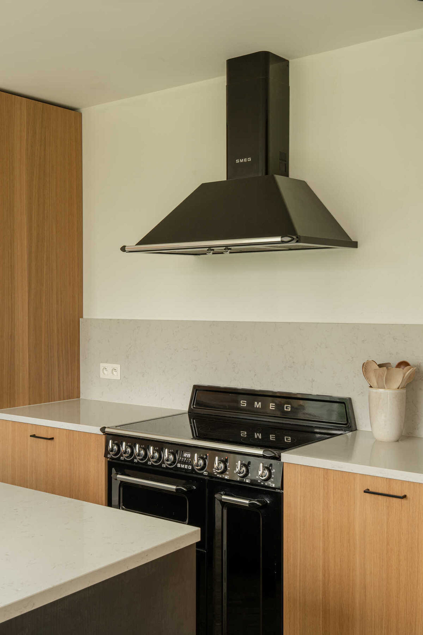 Les propriétaires souhaitaient des matériaux durables et haut de gamme, qui résistent au temps et donnent du caractère à la maison. "La qualité est primordiale pour nous, et cela se voit dans chaque détail : du parquet jusqu’à la cuisine équipée d’appareils Smeg. " Ils sont particulièrement satisfaits du résultat final. "C’était agréable de voir à quel point l’équipe portait attention à la précision et aux finitions. Tout est parfaitement à sa place. "
